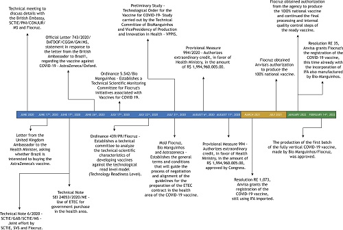 Figure 4 shows the timeline with the main events that have happened, from the beginning of negotiations with the Federal Government, through the formalization of the ETEC contract involving Fiocruz and AstraZeneca, until the production of the first batch of COVID-19 vaccine, fully, vertically manufactured by Bio-Manguinhos/Fiocruz. It is important to highlight that Fiocruz was the first institution to use this instrument for the development of a product for public health.