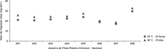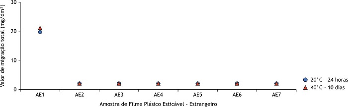 O potencial de migração de substâncias químicas adicionadas aos filmes esticáveis estrangeiros foi estudado analisando nas sete amostras em contato com simulante de alimentos gordurosos (solução de etanol a 95% (v/v)), em condições de ensaio em temperatura de 20°C por 24 h, simulando as condições de contato inferior a um dia, e 40°C por 10 dias, simulando as condições de contato superior a um dia, do filme plástico com o produto alimentício.