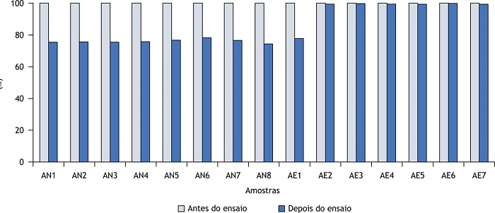 Analisando a Figura 3, fica demonstrada a perda de massa e o potencial de migração de substâncias ou aditivos incorporados aos filmes plásticos quando em contato com o simulante de alimentos gordurosos. Observa-se, nas amostras de filmes nacionais AN fabricadas de PVC, que se faz necessária a adição de aproximadamente 20–25% em massa de compostos aditivos. A presença do plastificante de baixo peso molecular reduz as interações entre as cadeias poliméricas do PVC, aumentando os espaços livres e a mobilidade dos aditivos e, em seguida, promovendo a sua difusão39. Nas amostras de filmes estrangeiros AE, observa-se que menos de 1% em massa dos compostos aditivos tiveram mobilidade na matriz polimérica para migrarem do sistema de embalagem para o simulante de alimento gorduroso.