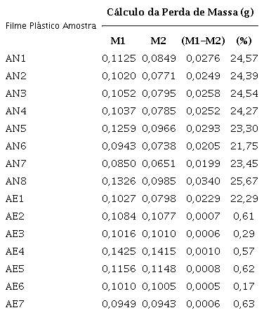 Os resultados percentuais de perda de massa após ensaio de migração foram da ordem de 21,75 a 25,67 (%), nos filmes flexíveis nacionais fabricados em PVC, identificados por AN1–AN8. Nos filmes plásticos estrangeiros, de diferentes marcas, os resultados percentuais de perda de massa foram da ordem de 0,17 a 22,29 (%) para os filmes identificados por AE1 a AE7. Nos filmes plásticos estrangeiros identificados no rótulo da embalagem comercial como sendo de PEBD, a perda de massa após o ensaio de migração total foi inferior a 1% para cada amostra.