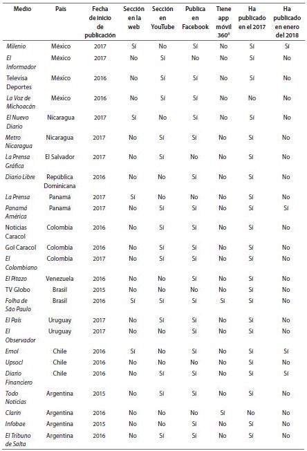 El año en el que comenzaron a realizar publicaciones de esta índole (teniendo en cuenta la fecha en que resurgió esta tecnología), si presentan una sec- ción específica en su web, si tienen un apartado especial en YouTube en el que aparezcan discriminados estos conteni- dos, si consideran Facebook como otra alternativa para publicaciones de carác- ter inmersivo, si ofrecen una app móvil apropiada (la mayoría de las veces esta suele estar conectada a una sección particular en una web), si publicaron durante el 2017 y, asimismo, durante el mes de enero del 2018. Estas variables ayudan a conocer desde qué fecha se ha extendido esta tecnología en América Latina, si hoy en día continúan difun- diéndose contenidos de este tipo, cuál o cuáles son las plataformas en las que más se publica, y si estos contenidos gozan de carácter propio y se hallan en secciones concretas.
