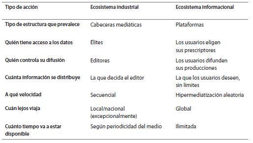 Como se observa en la tabla 1, mientras en el ecosistema industrial la estructura mediática se prestaba para ser administrada por sus directivos, en el informacional las dimensiones de las plataformas y su ritmo de funciona- miento hacen muy difícil el control de un ecosistema donde el usuario cumple un rol mucho más activo. Esto es lo que las plataformas han comprendido y lo que destacan Bell y Taylor (2017):