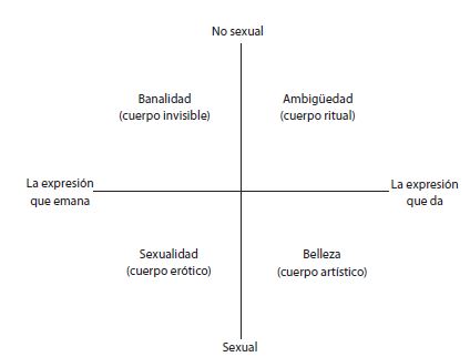En esta investigación, en el eje hori- zontal representaremos, en un extremo, la expresión que emana y, en el otro, la expresión que da el individuo o actuante (en términos de Goffman). En el eje ver- tical, se encontrarán, en un extremo, el carácter sexual y, en el otro, el carácter no sexual de la mirada del observador (en términos de Kaufmann). Ambos ejes representan los parámetros según los cuales analizaremos cómo se cons- truye el capital social en redes sociales en el caso de Adri Vainilla. Finalmente, usando esta matriz distribuiremos los comentarios recogidos en cada uno de los cuatro cuadrantes según corres- pondan a las miradas identificadas por Kaufmann.