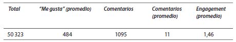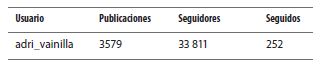 En esta línea, analizamos el con- tenido de los comentarios realizados por los seguidores de Adri Vainilla en las diez fotos con mayor engagement de su perfil de Instagram para indagar cómo se construye el capital social en redes sociales (ver anexo). Para Kaushik (2011), el engagement (compromiso) es la tendencia a atraer una atención o un interés favorables, pero, en el contexto de las mediciones o métricas, el reto es que este aspecto es muy difícil de medir. En este caso, registramos las siguientes cifras de publicaciones (media), seguidores (followers) y seguidos (following)