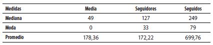 Pero ¿quién es el seguidor de Adri Vainilla? Podemos tener una aproxi- mación si analizamos la relación entre sus publicaciones, sus seguidores y sus seguidos. Para ello, utilizaremos las medidas de tendencia central, que son los puntos en una distribución obtenida, los valores medios o centrales de esta, y nos ayudan a ubicarla dentro de la escala de medición (Hernández, Fernández y Baptista, 2010, p. 292). Las principales medidas de tendencia central son tres: