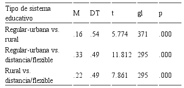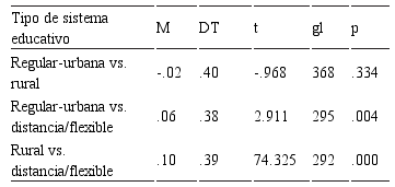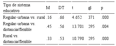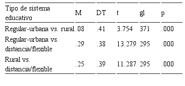 Mediante la prueba t de Student, que compara los promedios obtenidos (sobre 2 puntos) en cada dimensión por los tres grupos de estudio, se obtuvo que en la dimensión tecnología los estudiantes del sistema regular zona urbana obtuvieron el promedio más alto (M=1.20, DT= .28), seguidos por los estudiantes de la zona rural (M=1.12, DT= .28) y luego por los estudiantes del sistema a distancia y flexible (M=.89, DT= .26). La diferencia de muestras emparejadas fue estadísticamente significativa (véase tabla 1).