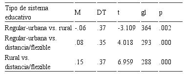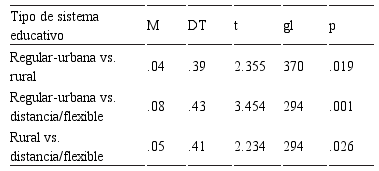 Ahora bien, en la dimensión ideología y valores se halló que los estudiantes del sistema regular zona rural lograron el promedio más alto (M=.94, DT= .27), en comparación con los de la zona urbana (M=.88, DT= .25) y los del sistema a distancia y flexible (M=.78, DT= .25). La diferencia de muestras emparejadas fue estadísticamente significativa (véase tabla 5).