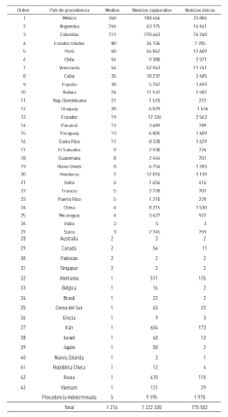 Una vez subsanadas manualmente tales anomalías, se llevó a cabo el análisis implementando funcionalidades como filtros, ordenamientos, quitar duplicados y tablas dinámicas. Se identificaron en total 1216 medios noticiosos procedentes de 43 países distintos (y cinco de procedencia indeterminada). En la tabla 1 se aprecia que en primer lugar se ubicó México, con una cuota de procedencia del 27,96 %; seguido por Argentina, con 20,06 %, y Colombia en un lejano tercer lugar, con 9,12 %. En otras palabras, a pesar de que la edición manifiesta ser de Colombia, predominó fuertemente la indexación de medios noticiosos mexicanos y argentinos.