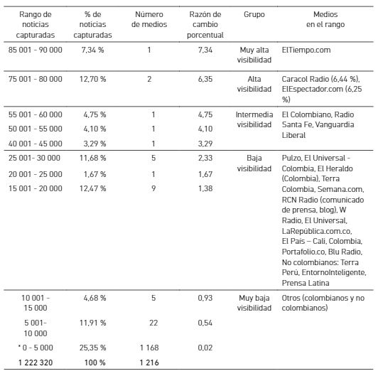 Al efectuar una vista detallada del total de los medios noticiosos indexados en esta edición, se observó que se ubicaban masivamente en el rango de muy baja visibilidad y como microproveedores. El 96,05 % tenía menos de 5000 noticias capturadas y el 96,71 %, menos de 1000 noticias únicas. En el otro extremo de la pirámide, solo el 0,08 % se ubicó en muy alta visibilidad y el 0,16 % como grandes proveedores. A partir de esto se infiere que aunque hubo un heterogéneo ecosistema noticioso (medios tradicionales migrantes, medios nativos digitales; grandes y populares, pequeños y poco conocidos; de prensa, televisivos, radiofónicos, agencias de noticias, entre otros) y que a primera vista podría entenderse como diversidad, en realidad, la agregación de noticias fue muy desigual y que el algoritmo StoryRank tuvo una fuerte y marcada preferencia de agregación por aquellos medios que son grandes productores de noticias, es decir, aquellos que cuentan con condiciones económicas y de infraestructura que les permiten producir con frecuencia, en gran volumen y con poca probabilidad de cesar tal actividad. Esto así, garantiza a Google News Colombia tener un inventario fresco de noticias y en permanente actualización.