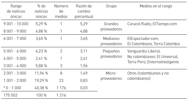 En la tabla 2 se aprecia una vista detallada de la agregación de noticias de los medios noticiosos colombianos en cuanto al volumen de noticias capturadas, que identifica su visibilidad dentro del servicio. La tabla 3, por su parte, ofrece una vista detallada del volumen de noticias únicas, que identifica su rol de proveedor. A partir del porcentaje de noticias capturadas y del porcentaje de noticias únicas correspondiente a cada fuente noticiosa indexada, se obtuvo la razón de cambio porcentual en cada caso y, con esto, se determina la clasificación de los medios noticiosos en diferentes grupos.