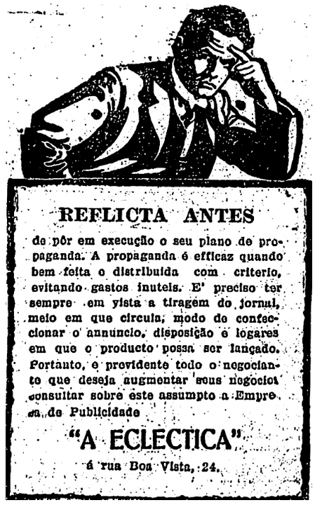 Piense antes de implementar su plan de publicidad. La publicidad es efectiva cuando se hace bien y se distribuye con criterio, evitando gastos innecesarios. Es necesario tener en cuenta siempre la circulación del periódico, el medio en el que circula, cómo hacer el anuncio, la disposición y los lugares en que el producto se puede lanzar. Por lo tanto, es recomendable que todo negociante que desea aumentar su negocio consulte sobre este tema a la Compañía de Publicidad “A Eclética”, en Rua Boa Vista, 245.