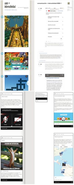 El contenido hace referencia a la temática y problemática del espacio. En el caso de Comunicación e Interactividad, el contenido se enfocó en las transformaciones sociales, políticas, éticas y culturales que han producido el uso y apropiación de las TIC. Esta temática y los contenidos asociados se plantearon de tal forma que conectaban los conceptos y teorías académicas con las prácticas mediáticas cotidianas y conocimientos empíricos de los estudiantes. Por ende, el contenido incluyó no solo libros y artículos académicos y seleccionados por el profesor (bibliografía), sino también textos, presentaciones y artefactos digitales producidos y seleccionados por los estudiantes durante el desarrollo del curso.
