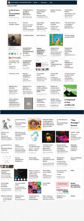 En sus últimas dos versiones (2020-2 y 2021-1), el aspecto del blog es similar. En ambas iteraciones utilicé la plantilla “Iconic theme” creada por egg.design, la cual es de uso libre y gratuito, tiene una estética de tipo minimalista y una paleta de colores monocromática. A diferencia de las plantillas utilizadas en el 2019-2 y el 2020-1, este diseño facilita la identificación de los posts enmarcándolos dentro de líneas negras delgadas. Además, permite desplegar el archivo del blog de forma visual, lo que favorece la localización y el acceso a los contenidos7. Al desplegar el archivo se genera automáticamente una página web en donde se visualizan todas las entradas creadas por los participantes, organizadas en forma de cuadrícula y representadas por cajas en las que se incluye el título y una imagen pequeña. Cada caja funciona como un hipervínculo a uno de los posts realizados por los participantes. A medida que se realizan nuevas publicaciones en el blog, la cuadrícula se hace más extensa a fin de apreciar visualmente la diversidad de artefactos digitales y el crecimiento orgánico del portal durante el desarrollo del curso. En la figura 2 se puede apreciar esta funcionalidad y las posibilidades que ofrece para una fácil navegación, vista panorámica y acceso rápido a los contenidos publicados.