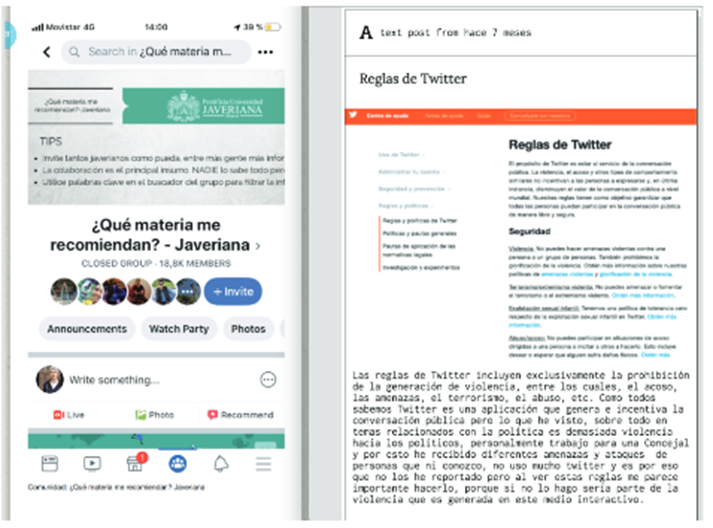 Mientras que el desafío del 2019-2 solo indicaba realizar la publicación utilizando únicamente una captura de pantalla de las normas o guías de la comunidad online favorita, el del 2020-1 incluía en las instrucciones identificar también la norma que los usuarios infringen más a menudo y un breve texto sobre un caso de infracción. La respuesta a los dos desafíos revela no solo una mayor elaboración en la composición del artefacto digital del 2020-2, en el que la imagen de las normas de Twitter es combinada con un breve texto argumentativo y crítico, sino también un proceso de reflexión y argumentación más alineado con el objetivo común del curso y el espacio de afinidad.