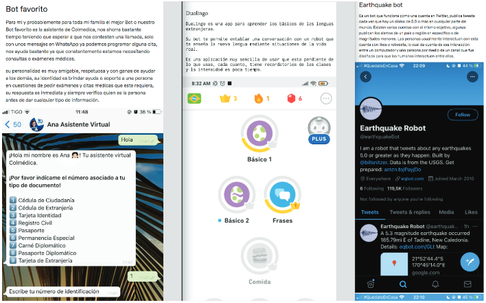 El análisis de los artefactos digitales publicados en el blog colectivo demuestra también que la mayoría de los participantes hace uso de sus dispositivos móviles para producir sus contenidos multimodales, combinando con destreza el lenguaje escrito y visual. Por ejemplo, la figura 4 muestra tres artefactos digitales que responden al desafío sobre la temática de “Cyborgs + bots”, en los que es posible apreciar que el elemento visual es una captura de pantalla realizada desde un teléfono celular (nótense, por ejemplo, los indicadores de señal, hora y batería en la parte superior de la imagen). Para este desafío los estudiantes identifican uno de los robots sociales con los que han interactuado y reflexionan sobre sus características en términos de identidad y personalidad, conectando el contenido académico con sus experiencias y conocimientos mediáticos y de cultura popular.