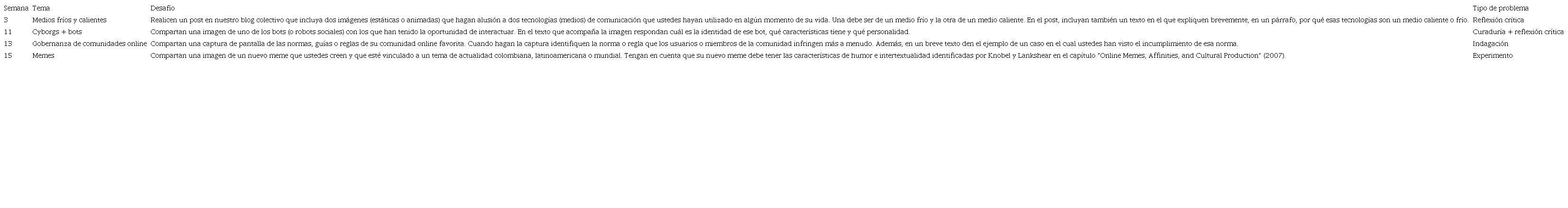 Como se observa en los ejemplos de la tabla 2, los retos son de diverso tipo y abordan diferentes temáticas. Algunos son problemas de autorreflexión, otros de indagación, otros de experimentación con medios y algunos otros de curaduría de contenidos. Independientemente de su tipo, todos los desafíos están diseñados para motivar el pensamiento crítico de los participantes, conectando las temáticas y lecturas académicas que se discuten cada semana con las experiencias, prácticas y conocimientos de los estudiantes. Además, los problemas son diseñados para apoyar la producción de artefactos digitales, abriendo oportunidades para que, por medio del hacer y la creación, los estudiantes conecten la teoría con la práctica.