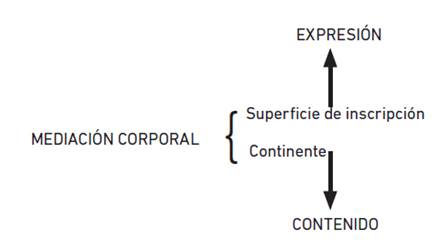 Dicho cuerpo-envoltura es definido como aquel que cuenta con una “red polisensorial y superficial que pone en contacto el Mí (la carne […]) y el mundo, o más precisamente, que recibe, de un lado, solicitaciones del mundo y, del otro, solicitaciones del Mí” (Fontanille, 2008, p. 192). Como superficie, el cuerpo-envoltura puede ser deformado, y cuenta con dos caras: una cara vuelta hacia el contenido (el continente) y otra cara vuelta hacia el otro plano (la superficie de inscripción). Llegamos así a la representación de la siguiente función semiótica: