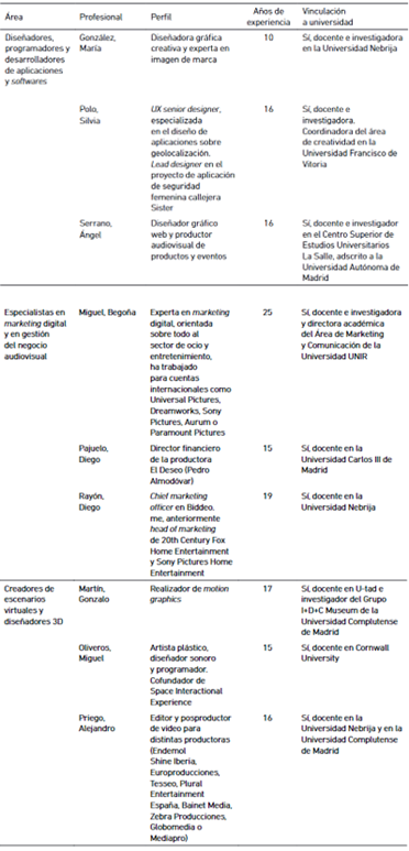 Pues bien, la metodología empleada en esta segunda fase será de tipo cualitativo; concretamente, la técnica seleccionada será la entrevista en profundidad, ya que consideramos que la opinión de expertos en estas tres áreas profesionales dibujará un escenario exacto, donde destaquen los perfiles, las competencias y la formación necesaria para el desempeño de cada actividad. Así, entrevistaremos a tres profesionales de cada área cuyas variables concurrentes de selección son las siguientes: (a) profesionales activos en el área por analizar; (b) profesionales con una trayectoria superior a diez años para que puedan plasmar las exigencias de una industria en reconversión; y (c) entrevistados, además, cercanos al ámbito universitario —docentes o colaboradores próximos a instituciones académicas—, conocedores de la necesidad de formular competencias y ámbitos de formación aplicables a este nuevo escenario.