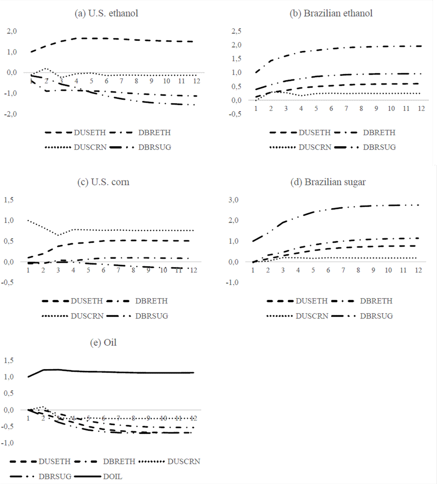 The variance decomposition of forecast errors for the U.S. ethanol shows evidence of several variables’ influence on prices, i.e., corn and oil prices can explain about 35% of ethanol prices in the U.S., while the Brazilian ethanol and sugar prices influence merely 17% of the U.S. ethanol market. In contrast, the Brazilian ethanol prices are more independent, explaining almost 80% of their own price variation. Sugar prices (7.9%), U.S. ethanol prices (7.3%) and oil prices (2.9%) exhibited a weaker connection with the Brazilian ethanol prices.