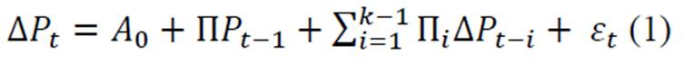 Where 𝐴. is a vector containing the intercept, and ∆𝑃𝑡 is a (. × 1) vector of the first difference of prices. The (n × n) matrix Π can be written as Π = αβ’, where . and . are (n × r) matrices containing the speed of adjustment parameters and the cointegrating vectors, respectively. The matrix Π𝑖 contains all the parameters estimated to represent the impact of lagged variables in the system, and 𝜀𝑡 is a vector of random error terms (LUTKEPOHL, 2006).