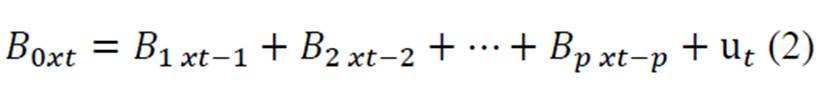 Where xt is the vector of prices in the system; Bj are the matrices (n x n) for each j and B0 is the matrix of contemporaneous relationship; ut is a vector n x 1 of orthogonal shocks where the components are not serially correlated.