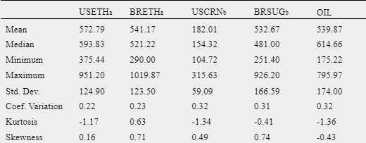 Before presenting the main findings from the time series models estimations, we present the summary statistics of the historical time series of the ethanol, oil, corn, and sugar prices in the U.S. and in Brazil from 2010 to 2016 (Table 1). Three variables (U.S. ethanol and corn and Brazilian sugar) show positive skewness and negative excess of kurtosis, suggesting the presence of asymmetric distribution with slim tails. Ethanol prices in Brazil show positive skewness and kurtosis, and oil prices negative skewness and kurtosis.