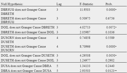 Furthermore, we implement Granger causality tests by using bivariate vector autoregressions to determine whether lagged information in one specific price set provides any statistically significant information to another price set forecast. If not, we conclude that the first price set does not Granger-cause the second. Once we have the results of all pairwise causality tests, we have a better indication of how markets in Brazil and in the U.S. are related. Therefore, this approach can help to build a more appropriate sequence of shocks when estimating impulse-response functions.