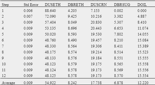 We then used a structural VECM to identify the short-run dynamics of prices. Basically, the structure of the SVECM was built by simulating the influence of cash ethanol from Brazil to the U.S. prices, and vice-versa. We also investigated relationships between corn and sugar prices in the U.S. and in Brazil, as well as the influence of oil prices on domestic ethanol prices. The results are expressed by the variance decomposition analysis shown in Tables 3 and 4.