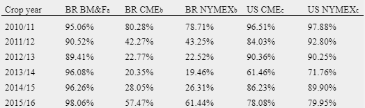 The results for the hedging effectiveness analysis are presented in Table 5. Each column shows the results for hedgers in Brazil and in the U.S. trading futures contracts on different exchanges, in different crop years. Brazilian hedgers who traded futures using the BM&FBovespa contracts expected to reduce between 89% and 98% of their revenue risk hedging cash prices, only. The simultaneous hedging strategies for Brazilian hedgers trading ethanol futures contracts at the CME Group or NYMEX seem to have poorer expected results for all years. For most of the crop years, the expected results were significantly lower than the first hedging strategy (BM&FBovespa ethanol futures only).