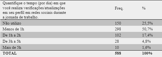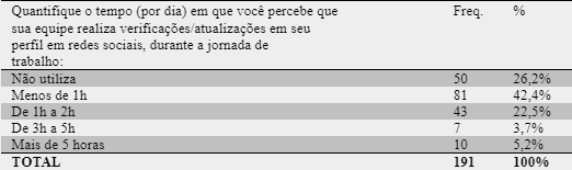 Entre as opções de acesso, 40,8% informaram que costumam acessar suas redes através de dispositivos móveis, sendo que o segundo local mais utilizado é em casa, 27,6%, em seus computadores particulares. E ainda 55,6% afirmam que nunca acessam seu perfil nos computadores da empresa, neste aspecto surge o questionamento se a empresa possa ter realizado o bloqueio dos sites das redes sociais para coibir o acesso dos empregados. A Tabela 9 apresenta o tempo em que o usuário se percebe conectado as redes sociais no local de trabalho.