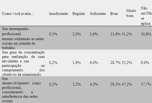 Os usuários avaliam seu desempenho profissional, mesmo utilizando as redes sociais durante a jornada de trabalho, como muito bom (51,2%). Avaliam ainda como muito bom o seu grau de concentração e o seu desenvolvimento como profissional. Sua percepção é de que o acesso às redes sociais durante a jornada de trabalho não gera impacto sobre eles ou sobre as atividades que estão desenvolvendo. Contudo, mais de 20% não souberam ou não quiseram opinar sobre o seu desempenho profissional.