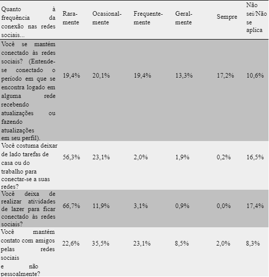 Observa-se que apenas 13,3% dos entrevistados responderam que geralmente ficam conectados as redes sociais e ainda 17,2% que sempre estão conectados. E a grande maioria respondeu que raramente deixa de lado tarefas de casa ou de realizar atividades de lazer para ficar conectado, 56,3% e 66,7% respectivamente. O acesso à Internet, segundo Soda e Zaheer (2012), se torna o principal relacionamento na vida da pessoa, e pode-se tornar um grande problema, contudo a pesquisa revela que o usuário não se mantém conectado de forma constante, ou talvez não perceba este acesso como frequente, apenas como ocasional.