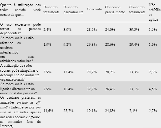 Nesta tabela buscou-se avaliar a concordância do usuário quanto à utilização da rede social em excesso, podendo gerar alguma dependência. Dos respondentes, 39,3% dos respondentes concordaram totalmente que o uso excessivo pode tornar as pessoas dependentes, 29,3% dos respondentes concordaram que o uso de redes sociais afeta aos usuários interferindo em suas atividades rotineiras. Ainda, observa-se que 32,7% dos respondentes concordam ainda que as redes sociais estão ligadas diretamente ao emocional das pessoas.