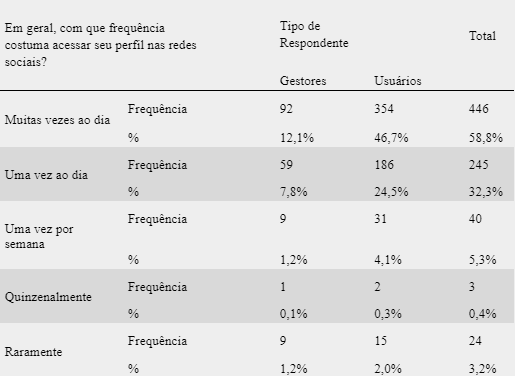 Ao longo desta pesquisa é possível evidenciar que a percepção de usuários quanto à utilização de redes sociais no meio organizacional vem ao encontro da dos gestores. Observa-se, por exemplo, que o tempo relacionado ao acesso às redes sociais é similar entre os gestores e os usuários.