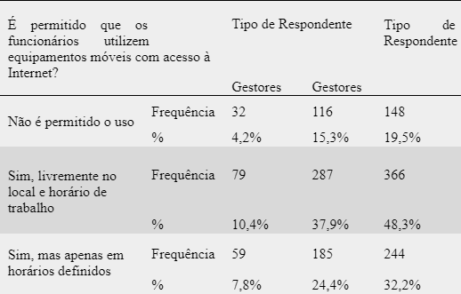 Questionados se o seu local de trabalho permite o acesso a redes sociais nos computadores da empresa, 54,4% dos respondentes (412 pessoas) indicaram que a empresa não permite o acesso. Entretanto 90,1% dos respondentes admitiram que acessam seus perfis através de dispositivos móveis durante o horário de trabalho. Este dado justifica o uso do celular como dispositivo mais citado pelos usuários, pois a empresa pode realizar bloqueios em sua rede, mas o acesso através de celulares, com Internet independente, não pode ser gerenciado ou controlado pela gestão.