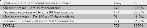 Utilizou-se a escala definida pelo SEBRAE (2015) para divisão e classificação do porte das empresas, empresas, para classificar as empresas de atuação dos respondentes. A Tabela 1 apresenta o porte das empresas em que os respondentes atuam.