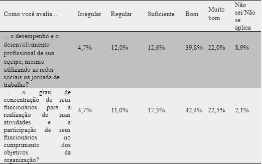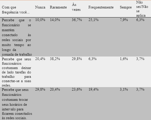 Tinha-se como pressuposto a existência de grande influência das redes sociais no ambiente organizacional e acreditava-se que os usuários passam muito tempo acessando redes de comunicação em seus dispositivos móveis, em detrimento da realização de tarefas de sua responsabilidade funcional. Contudo, entre os respondentes, constatou-se um resultado diferente: os gestores percebem que o acesso às redes sociais, durante a jornada de trabalho, não é frequente; embora ocorra, não interfere no desempenho do funcionário.