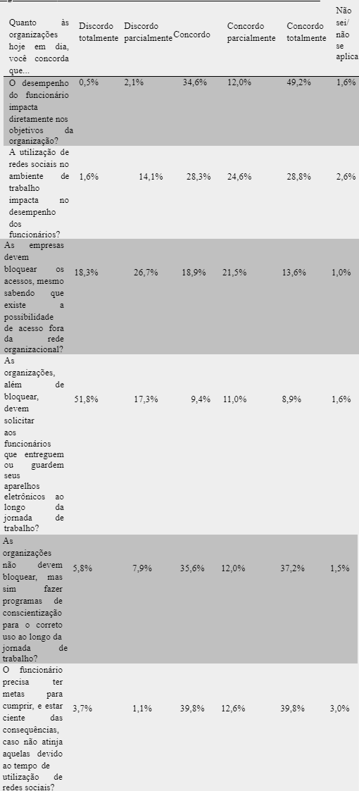 Evidencia-se que 49,2 % dos respondentes, que são gestores, concordam totalmente que o desempenho do funcionário impacta diretamente nos objetivos da organização e 28,8% concordam que a utilização de redes sociais impacta no desempenho dos funcionários. Chama atenção que 0,5% dos gestores discorda totalmente que o desempenho do funcionário impacta nos objetivos da organização. A percepção dos gestores permite a interpretação de que o uso e acesso a redes sociais impacta diretamente nos resultados de seus subordinados, e como visto anteriormente, a maioria dos acessos ocorre através de dispositivos móveis. Atitudes para o uso descontrolado são avaliadas pelos gestores como possíveis. Dentre as opções, 13,6% dos gestores concordam totalmente que as organizações devem bloquear os acessos e 8,9% dos gestores optariam em recolher os aparelhos de seus funcionários antes de iniciar a jornada de trabalho. Contudo, uma grande parte dos gestores (37,2%) entende que deve haver programas de conscientização quanto ao uso. Esta percepção aparece entre 37,2% dos respondentes, e 39,8% dos gestores ainda entendem que a melhor opção é estabelecer metas e objetivos aos funcionários.