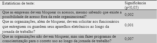 Também na percepção dos usuários, o acesso, mesmo realizado nos computadores da empresa ou através de seus dispositivos móveis, não apresenta influência negativa no cumprimento das metas e objetivos da organização. Isso corrobora a ideia de Rushkoff (2012) de que, com a evolução das TICs, o trabalhador passa a realizar multitarefas, buscando dar atenção a mais de uma coisa simultaneamente e atender rapidamente as tarefas executadas no dia a dia das empresas. Trata-se do perfil atribuído a uma geração de pessoas cada vez mais conectada, seja em cargos de gestão ou de execução.