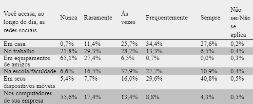 Constatou-se que 35,4% dos respondentes afirmam que raramente acessam seus perfis durante a jornada de trabalho, e apenas 4,9% dos respondentes informaram que quase sempre realizam este acesso. Ainda 25,5% dos respondentes alegam que às vezes acessam suas redes sociais durante a jornada de trabalho. Questionados também sobre os locais que costumam acessar suas redes, os usuários indicaram os locais utilizados, conforme apresentado na Tabela 8.