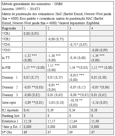 Fonte: elaboração própria.Os efeitos da volatilidade da taxa de câmbio nas exportações do setor de metalurgia no Brasil não são tão claros (ver Tabela 8), tendo em vista um efeito negativo da volatilidade da taxa de câmbio nominal (VCN1) nas exportações de tal setor, sendo o nível de significância de 10%, ao passo que a volatilidade VCR1, a VCR2 e a VCN2 não apresentam nenhum efeito.