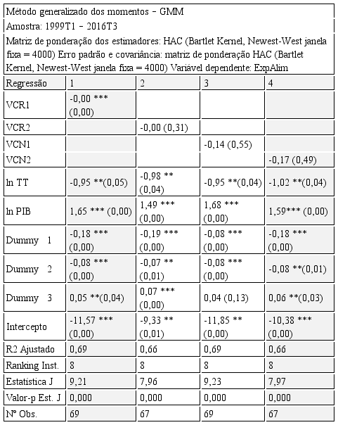 Fonte: elaboração própria.Os resultados das estimativas dos efeitos da volatilidade da taxa de câmbio real e nominal nas exportações de produtos alimentícios não apresentam nenhum efeito. Tais resultados são semelhantes àqueles encontrados nas estimativas da volatilidade no setor de metalurgia e no setor de celulose, papel e produtos de papel. Pode ser que o setor alimentício tenha a opção de vender no mercado interno ao verificar que a volatilidade da taxa de câmbio está afetando a sua lucratividade.