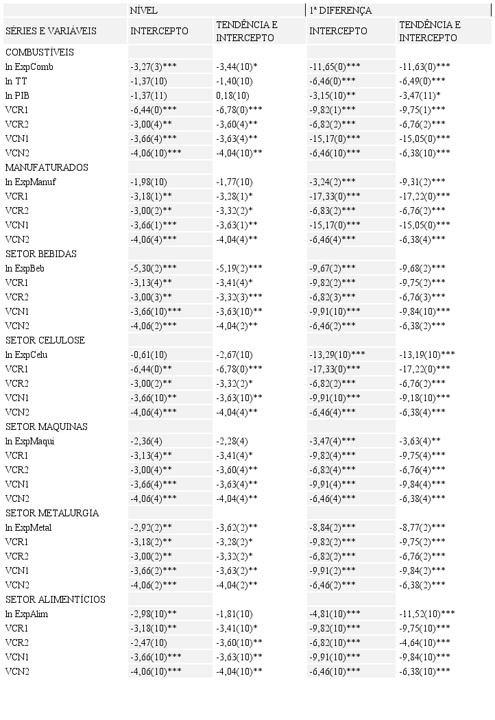 Notas: ( ) representa o número de defasagens incluídas, que são selecionadas com base no Akaike Information Criteria (AIC) para teste ADF. O asterisco (*) denota a significância estatística: *** 1%, ** 5%, *10%. Os valores são fornecidos pelo Eviews.