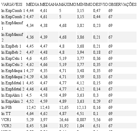 As estimativas efetuadas pelo MGM neste estudo têm a intenção de verificar os efeitos que a volatilidade da taxa de câmbio pode causar nas exportações brasileiras. A Tabela 2 apresenta as estatísticas descritivas das variáveis adotadas neste estudo.