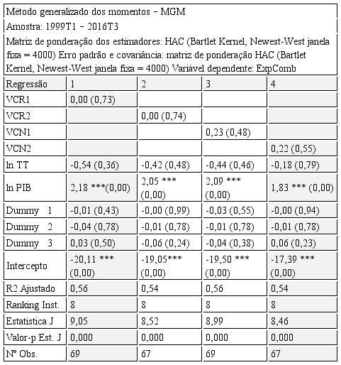 A Tabela 3 apresenta os resultados das estimativas, mensurando os efeitos da volatilidade da taxa de câmbio (manifesta nas variáveis independentes) sobre a variável dependente ExpComb. Os resultados obtidos, para a variável de interesse volatilidade, não se mostraram estatisticamente significativos em nenhuma das regressões estimadas, daí a volatilidade da taxa de câmbio não influenciar as exportações brasileiras de combustíveis.