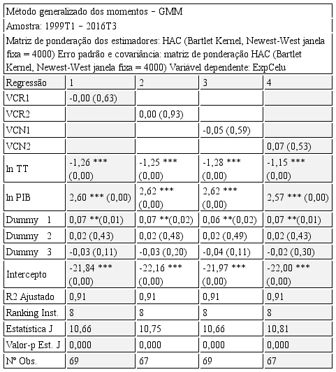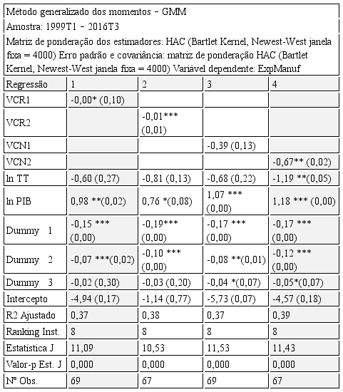 Fonte: elaboração própria.Os resultados apresentados na Tabela 4 sugerem que a volatilidade cambial impacta negativamente as exportações de manufaturados do Brasil em três das quatro estimativas verificadas. A volatilidade da taxa de câmbio mostrou-se estatisticamente significativa ao nível de 10% na VCR1, enquanto o resultado na VCR2 foi mais interessante: significativo a 1%. Quanto à VCN2, foi encontrado um nível de significância de 5% da volatilidade da taxa de câmbio. Convém destacar que todos os coeficientes apresentaram resultados negativos, ou seja, um aumento da volatilidade da taxa de câmbio diminui as exportações de manufaturados.