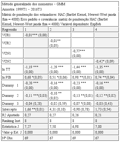 Quanto aos efeitos da volatilidade da taxa de câmbio nominal e real nas exportações de bebidas (ver Tabela 5), os resultados mostraram-se estatisticamente significativos em todas as estimativas efetuadas: nível de significância de 1% na VCR1 e na VCN1, estatisticamente significativos ao nível de 5% na VCR2 e de 10% na VCN2. Como todos os coeficientes apresentam resultados negativos, são semelhantes aos resultados negativos encontrados na Tabela 4.