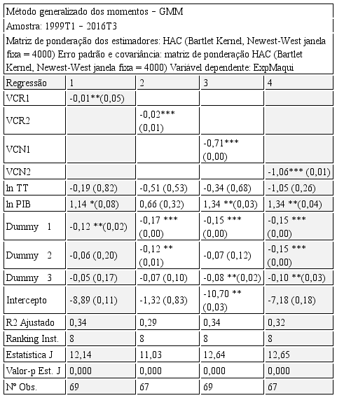 Analisando a Tabela 7, verificam-se os efeitos negativos da volatilidade da taxa de câmbio nas exportações do setor máquinas e equipamentos. A volatilidade da taxa de câmbio real apresenta efeito significativo ao nível de 5% na VCR1 e de 1% na VCR2, VCN1 e VCN2, alterando somente os valores dos coeficientes. Entretanto, os sinais dos coeficientes são negativos, indicando que um aumento na volatilidade da taxa de câmbio diminui as exportações para o setor de máquinas e equipamentos.