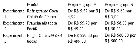 Os experimentos foram realizados por meio de três coletas de opiniões. Cada uma delas envolveu um tipo de produto diferente. Os respondentes de cada pesquisa foram divididos em dois grupos – A e B – em função da presença ou ausência do dígito “9” no preço informado em um anúncio: no grupo A, os respondentes foram expostos a anúncio em que o preço continha aquele dígito na composição; no grupo B, por sua vez, o preço anunciado não continha o dígito. Essa diferenciação tinha o propósito de verificar se a presença de determinada variável poderia provocar determinado efeito e se sua ausência implicaria a ausência do mesmo efeito (COOPER; SCHINDLER, 2003).