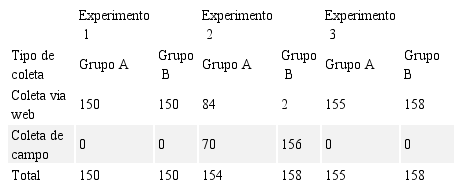 Os dados relativos ao experimento 1 foram coletados entre os dias 30/12/2013 e 08/01/2014, enquanto os relativos aos experimentos 2 e 3, entre os dias 05/11/2014 e 23/02/2015. A pesquisa referente aos dados coletados de forma presencial, relativos ao experimento 2, ocorreu entre os dias 14 e 17/02/2015, durante evento realizado em um parque de exposições.